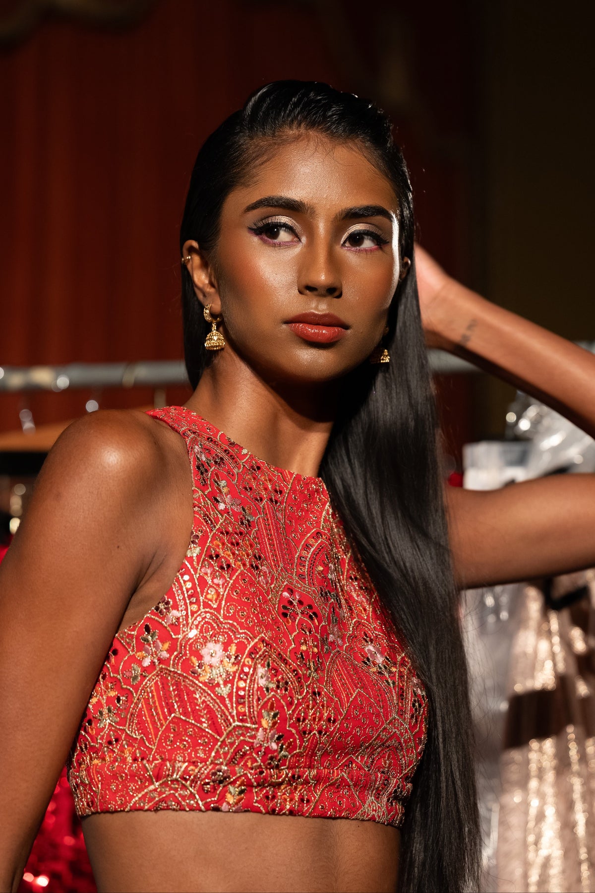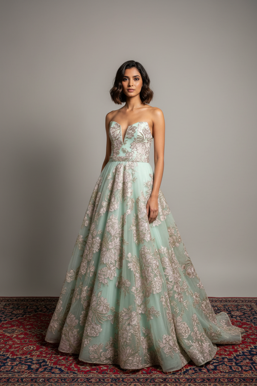 Presented at New York Bridal Fashion Week, explore Harleen Kaur's latest bridal and groomswear featuring 3D printed embellishments, vibrant colors, and modern silhouettes.