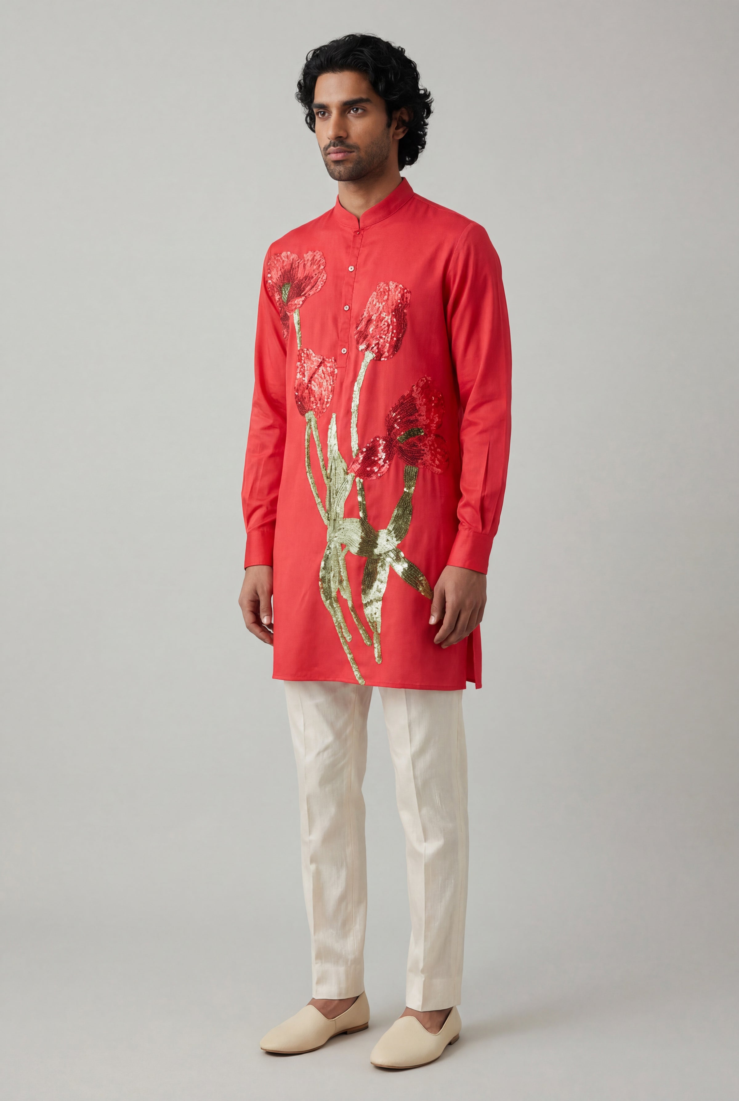 The GIANNI Red Floral Kurta features a vibrant red Egyptian cotton base with intricate hand-embroidered sequin florals. Each embellishment is carefully placed, creating a unique floral pattern in select areas of the kurta, both front and back. The floral motifs feature shades of red and green and elevate this kurta, making it perfect for the modern Indian groom.