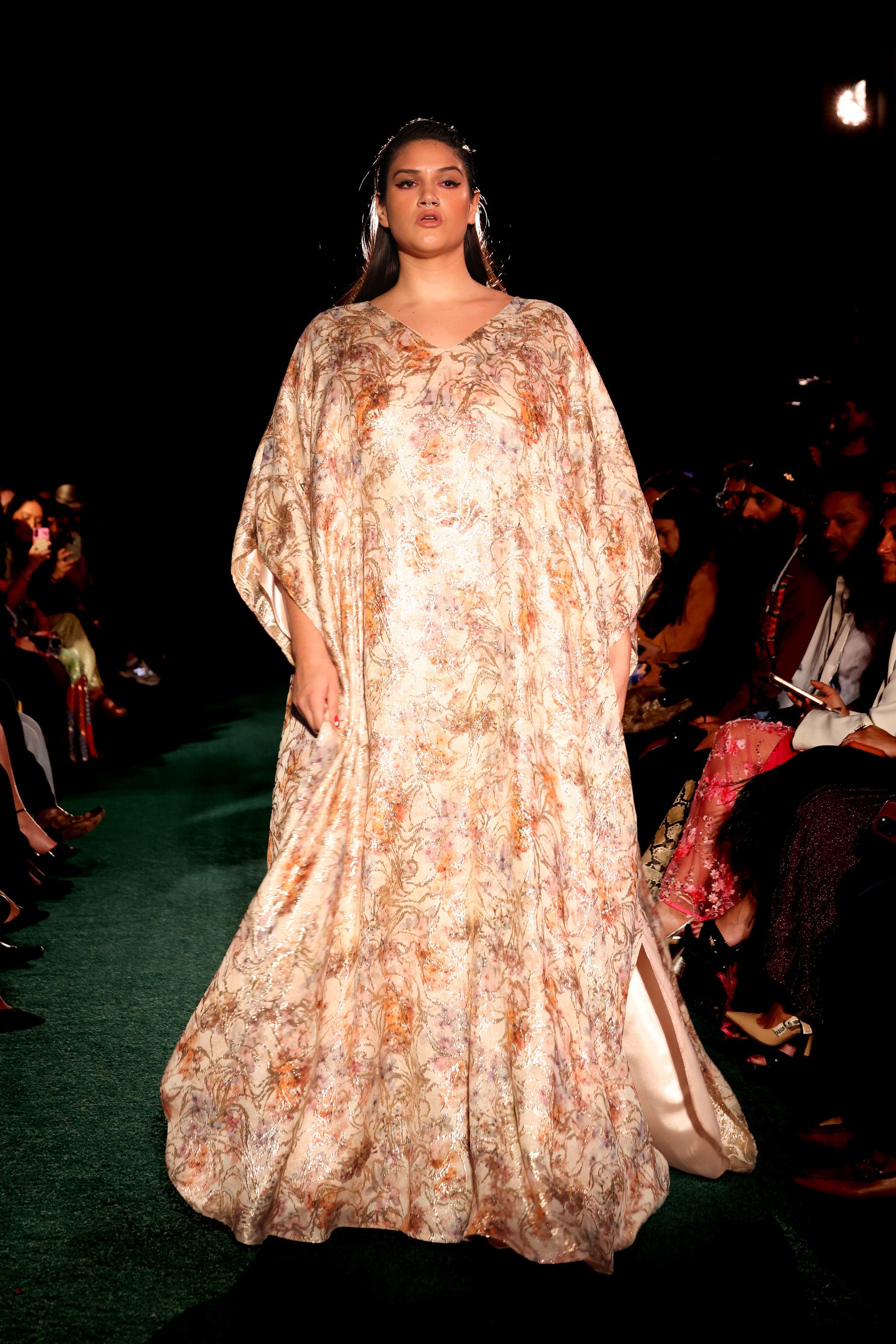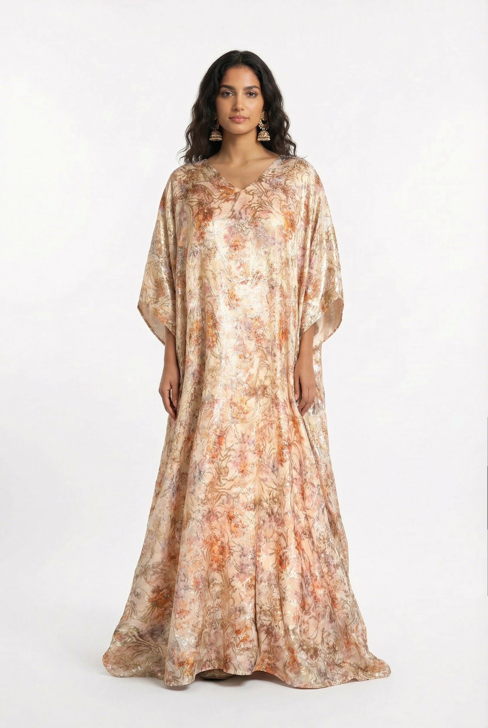 The MAKENA Cream and Gold Floral Kaftan is an effortlessly comfortable option for an Indian wedding event and beyond. Perfect for a destination wedding or a beach vacation, the rich gold metallic yarn is woven through a floral print featuring shades of purples, oranges and blues, creating a design that feels both luxurious and wearable. The relaxed kaftan silhouette drapes beautifully, offering freedom of movement without compromising on style.