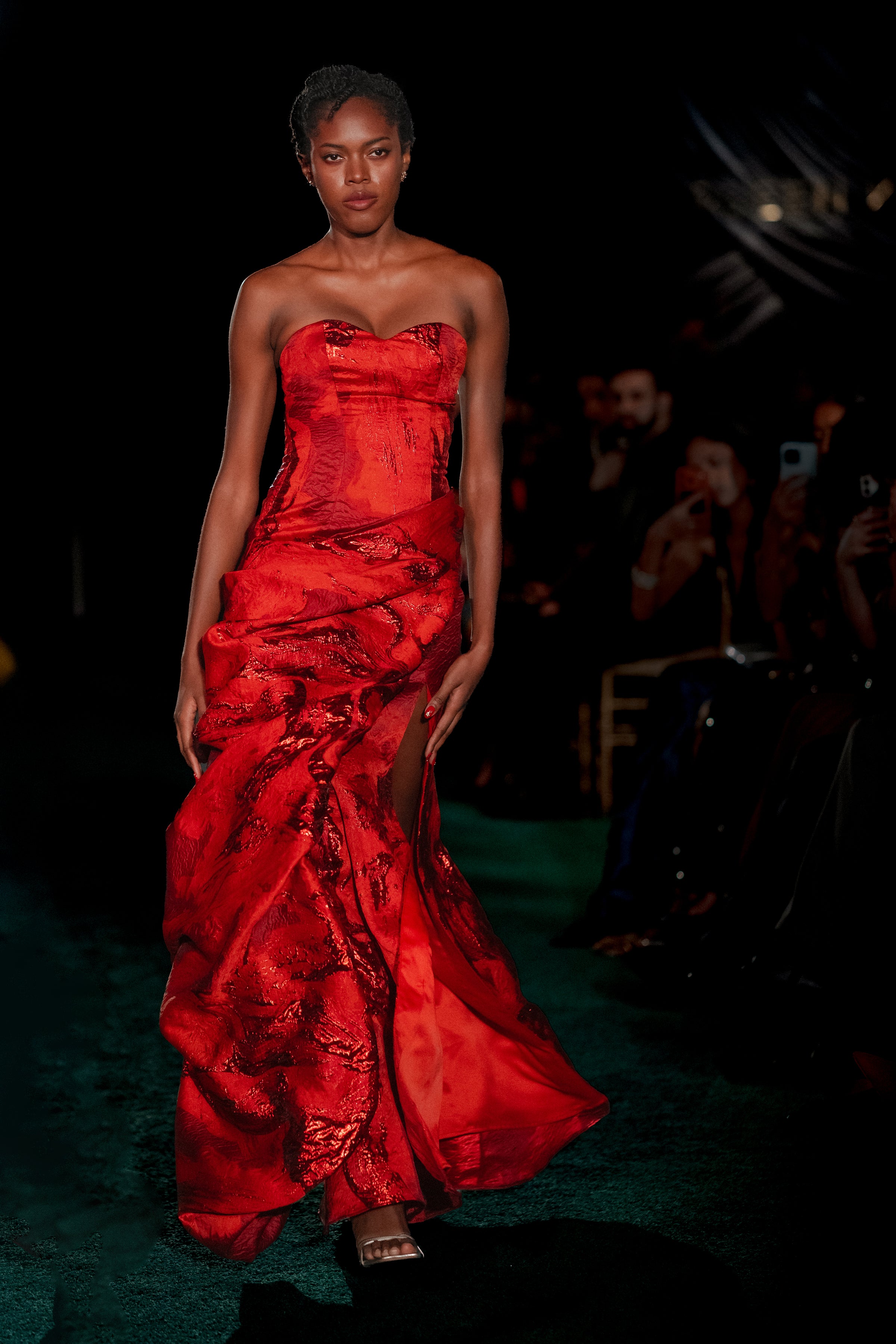 Captivate any room with the beautiful SARANI gown. The strapless silhouette showcases a perfectly fitted bodice, while luxurious jacquard fabric catches the light with every movement. Graceful draping, reminiscent of a structured sari, moves with you as you walk and opens up to a daring slit, creating an effortless style that's rooted in tradition.