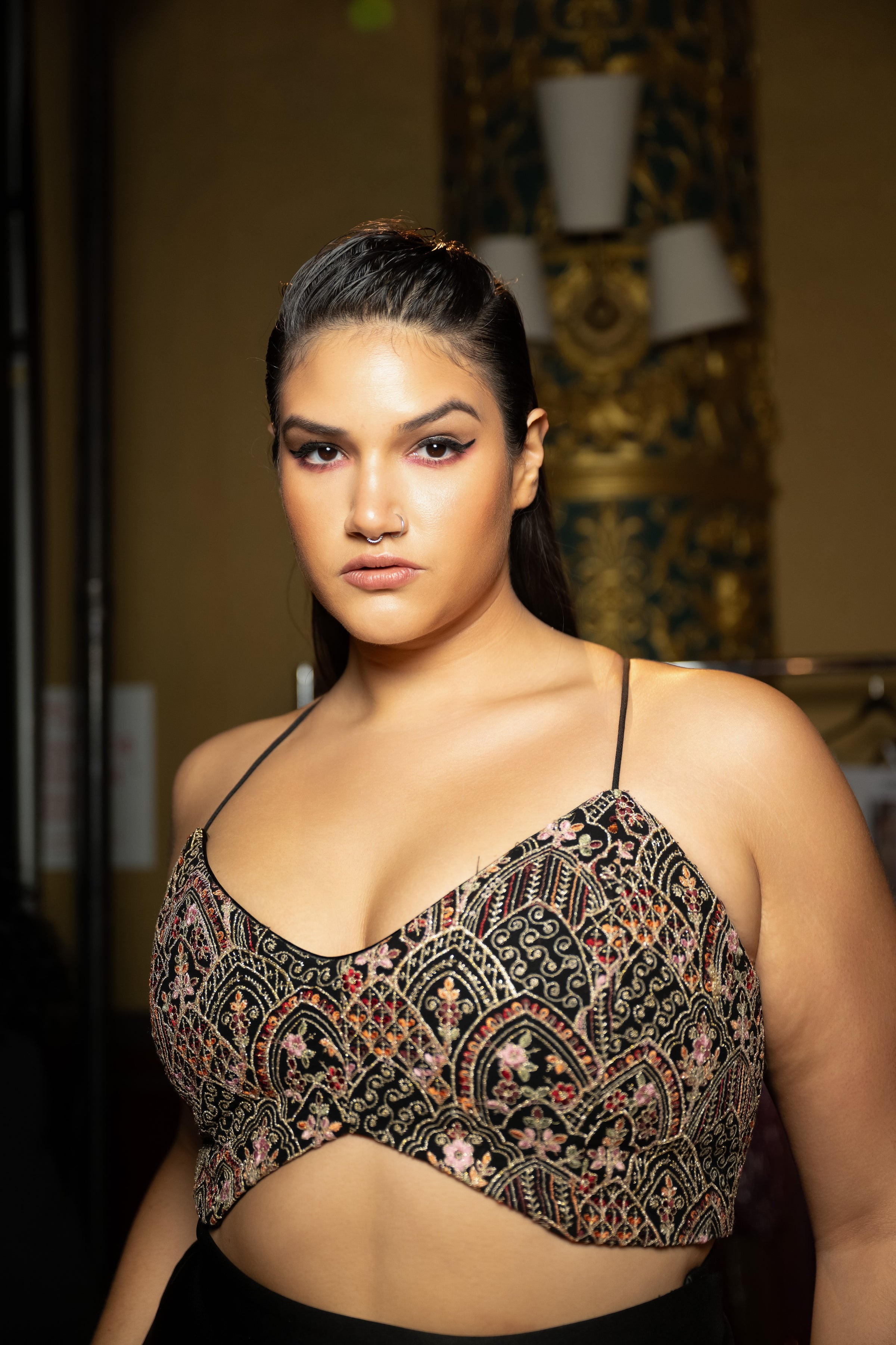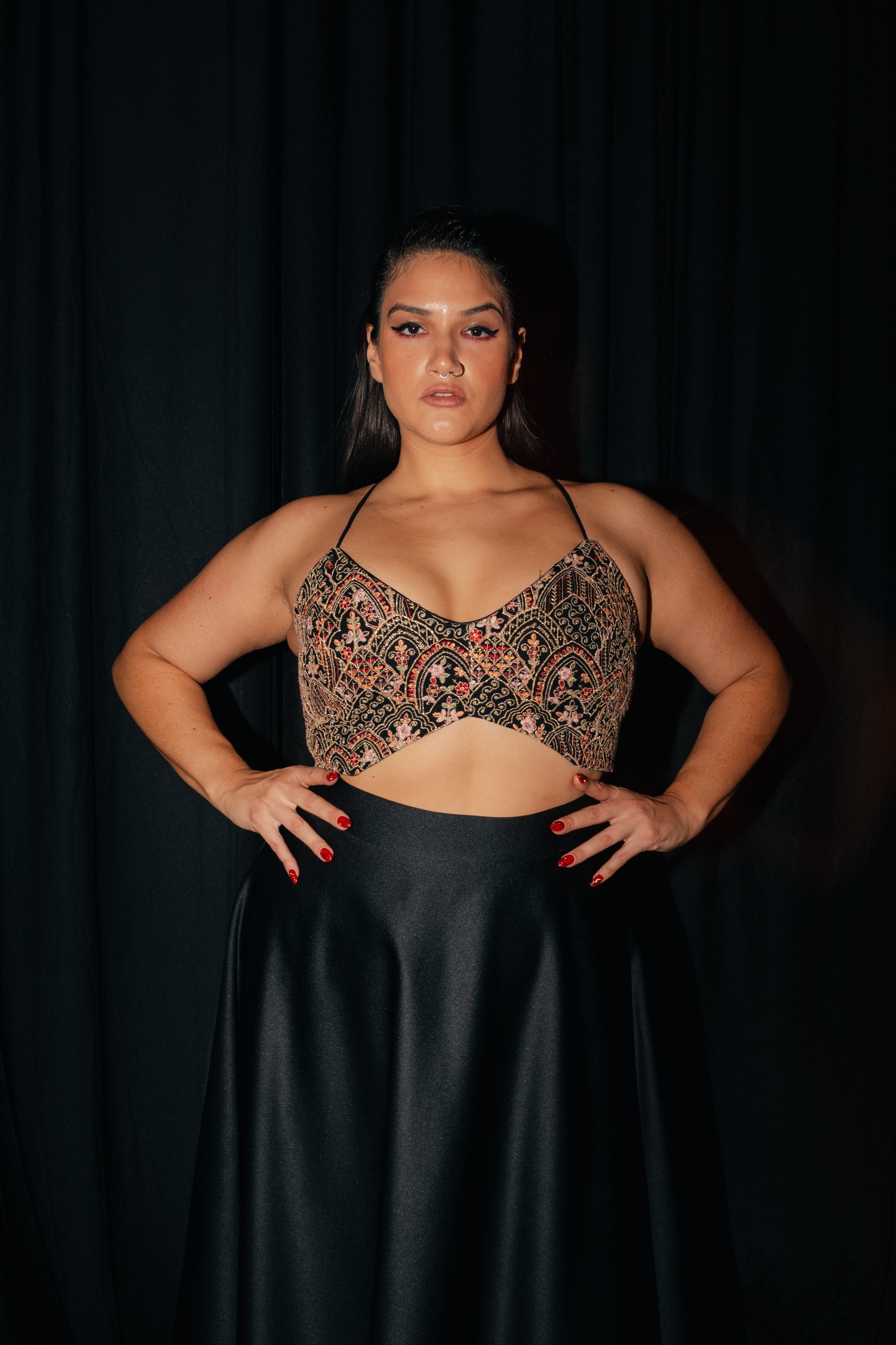 The SAVARA Black Embroidered Lehenga Top is made from a delicate gold and red embroidered georgette. The tie-back design creates a flattering silhouette with adjustable comfort. Perfect to pair with the DALILAH skirt for a stunning lehenga look, or choose to pair it with wide-leg trousers for a fun Indowestern look.