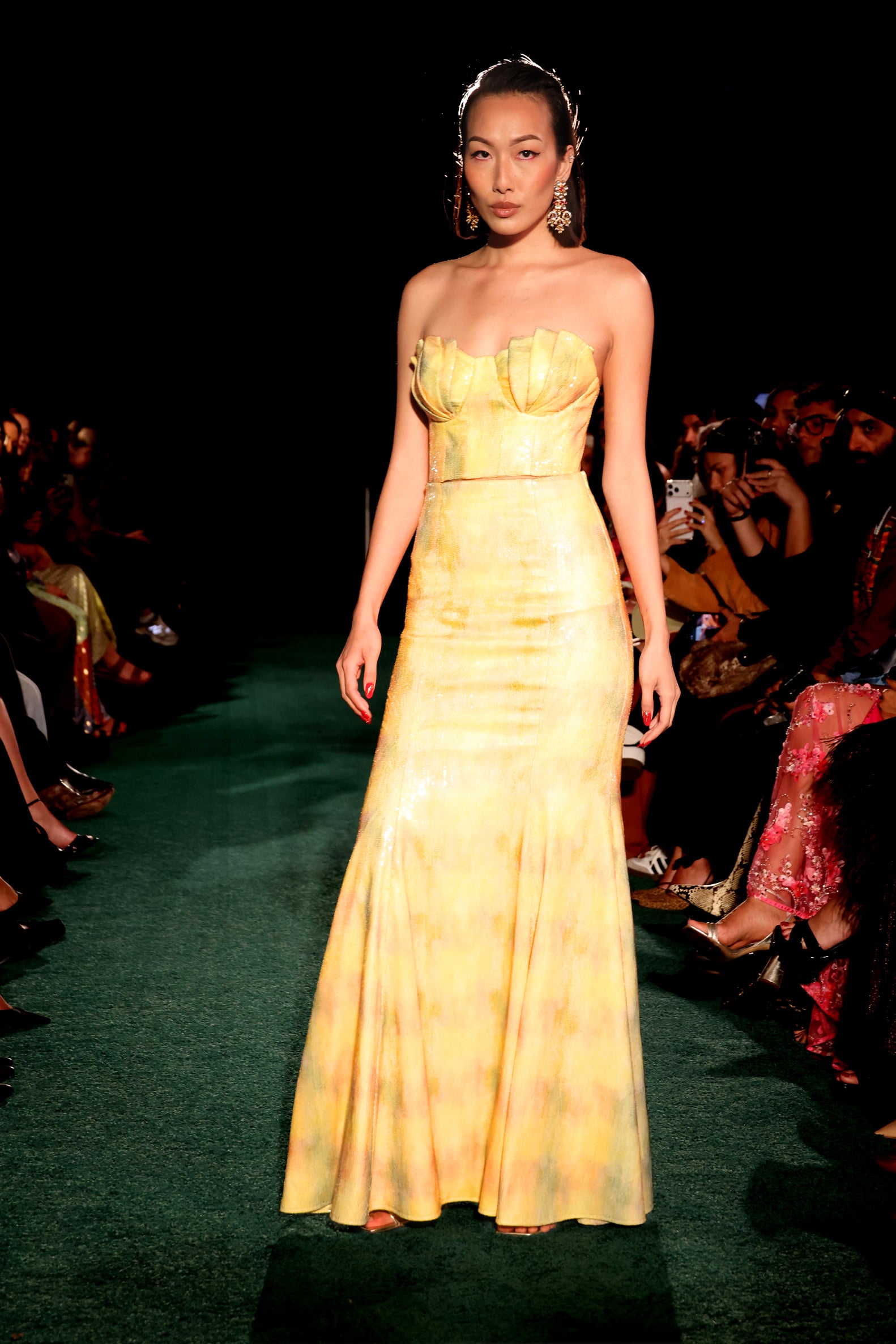 The SHAINA Skirt captivates with its mermaid silhouette adorned in recycled sequins in shades of yellow, green and orange. The sculpted mermaid cut hugs gracefully before flaring at the hem, creating dramatic flair and refined femininity.