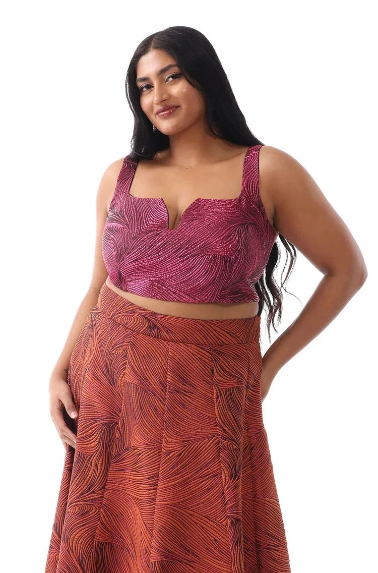 Mesmerize in this pink and orange wavy jacquard lehenga top. In a dazzling ombre fabric, style with a saree or lehenga skirt for a Sangeet or the perfect Reception party outfit!