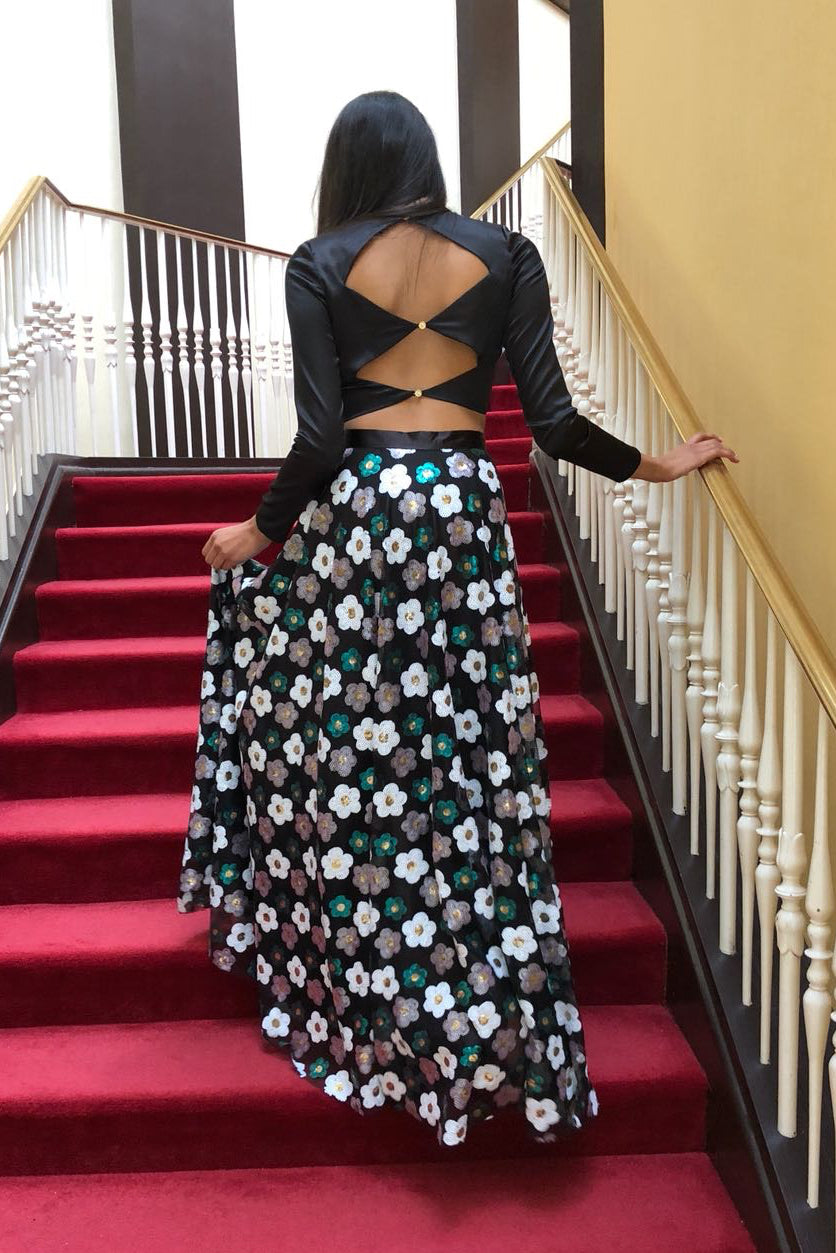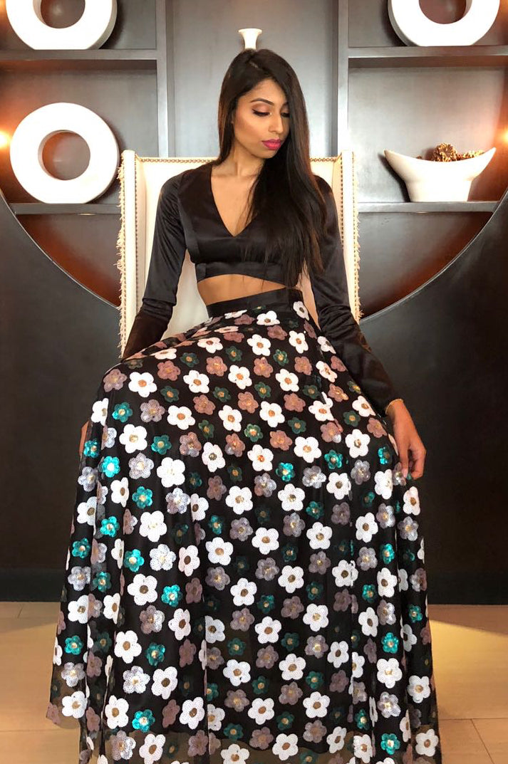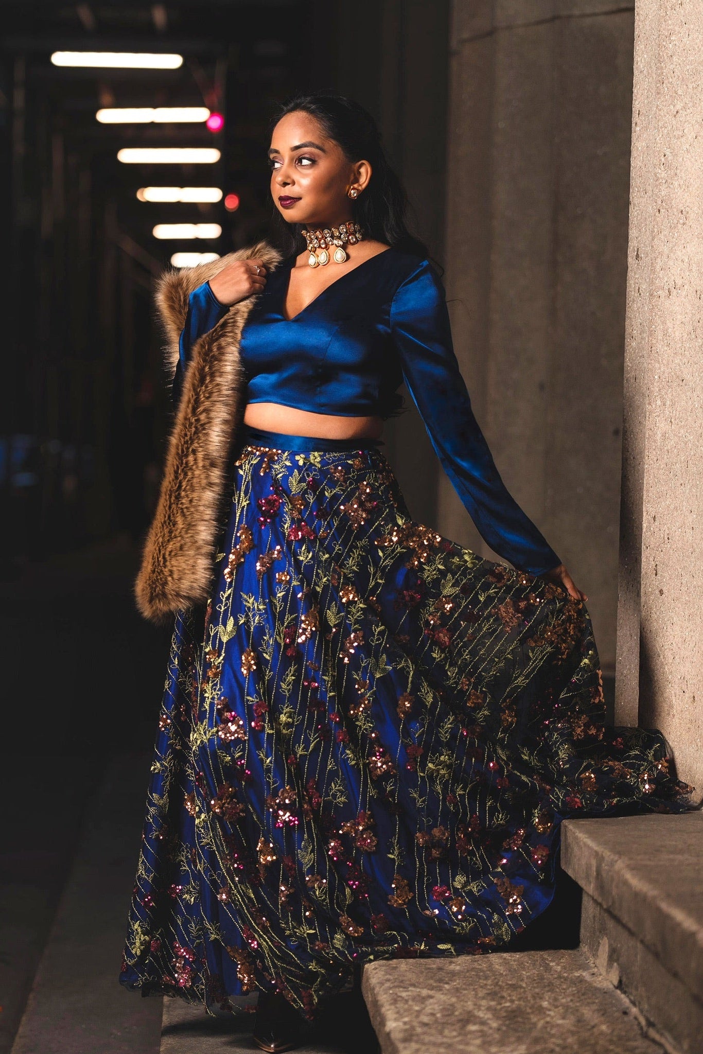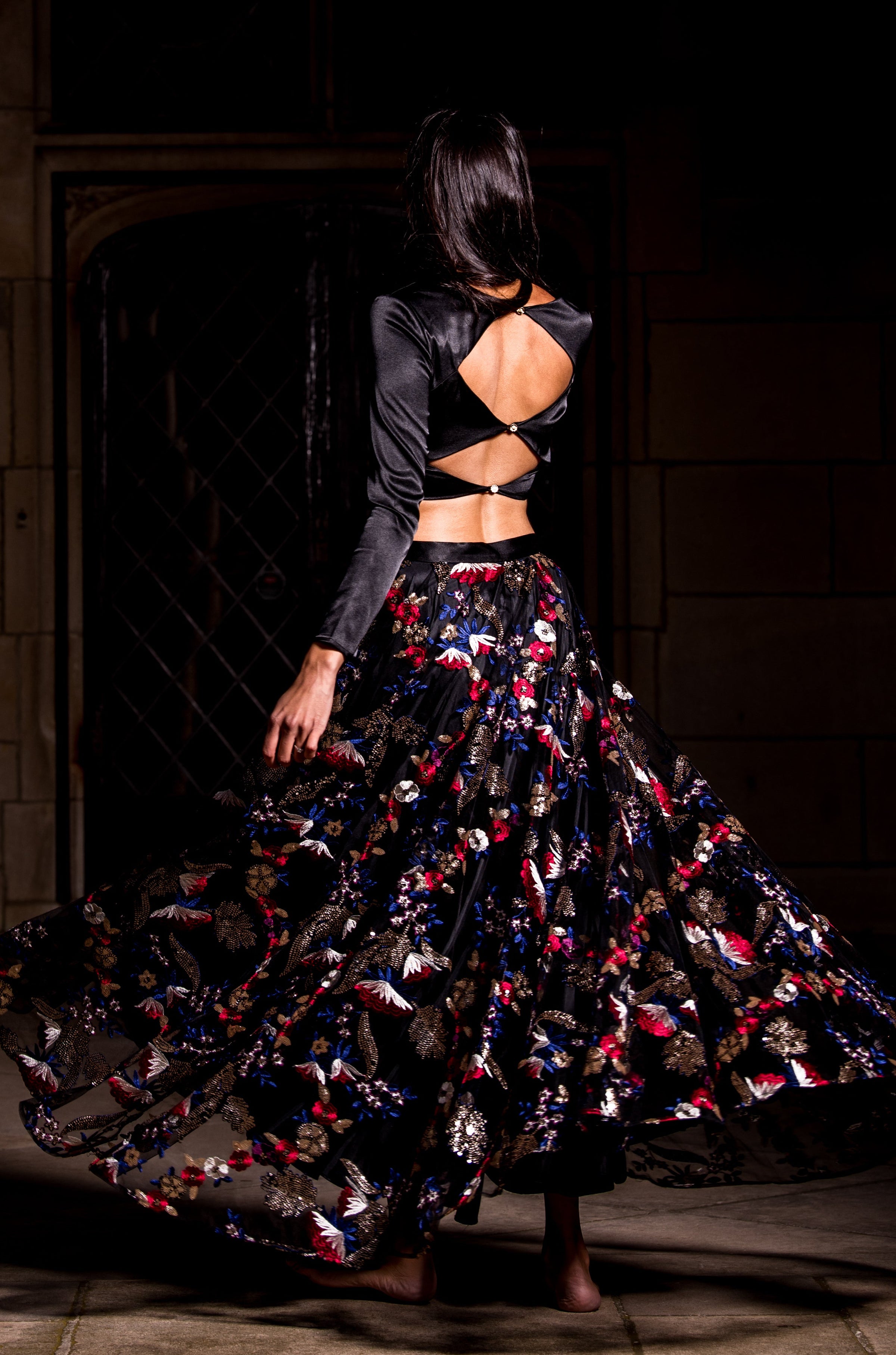 Long sleeve lehenga top with a v-neck in comfortable and soft stretch satin. Designed with a unique open-back with a mini silver floral button closure.