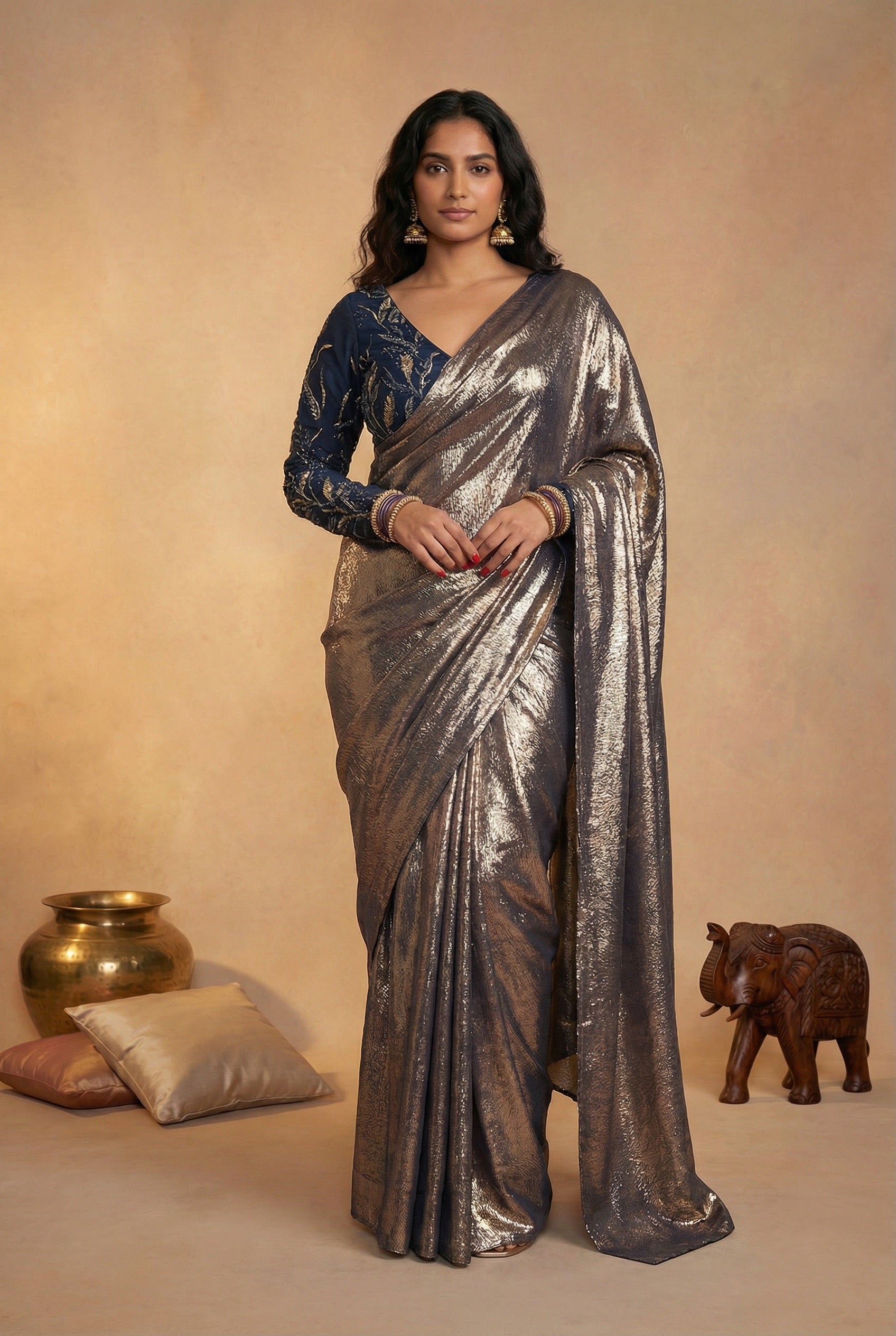 The SADE Pre-Stitched Navy and Gold Sari is a fusion of tradition and modernity. This beautifully flowing metallic viscose creates an effortless looking sari that's designed to be both lightweight and eye-catching. The pre-pleated pallu makes this so easy to wear and perfect as a guest for an Indian wedding.