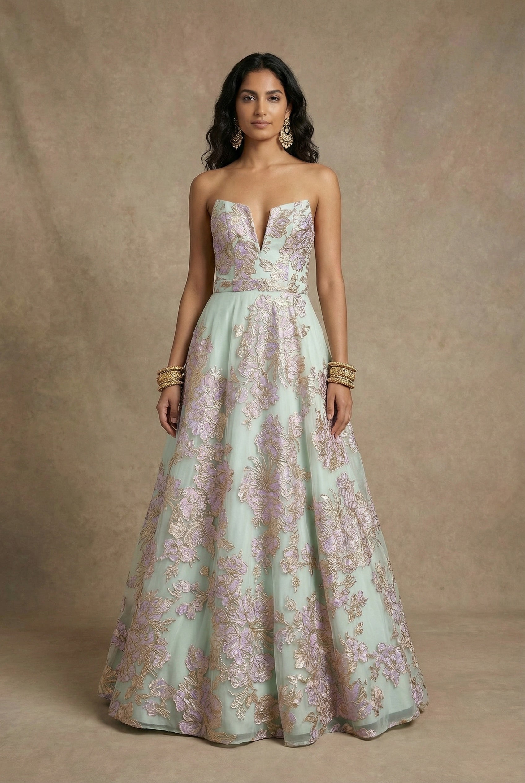 The TASHITA Gown is features a beautiful strapless silhouette, perfect for any occasion. With a blend of soft mint, delicate lilac, and luminous gold tones, this gown can be worn by the bride or a guest. Florals in a beautiful lavender purple are outlined with gold rafia and embroidered on a tulle base to create an ethereal look. Great for a guest to wear to a South Asian wedding, or for a bride at their welcome dinner.