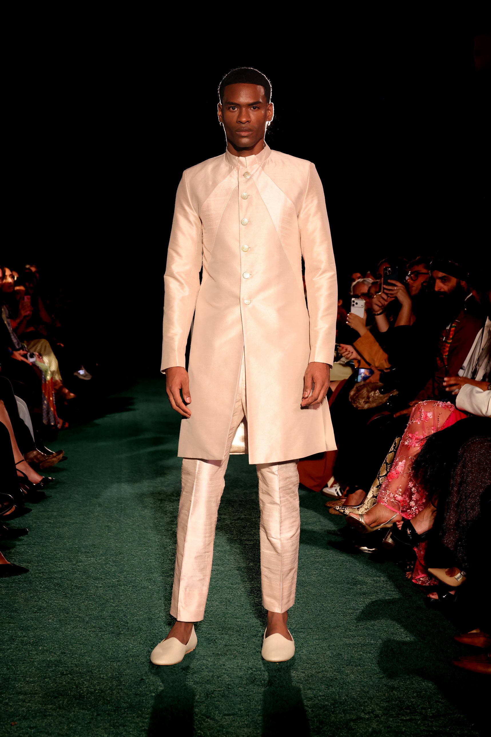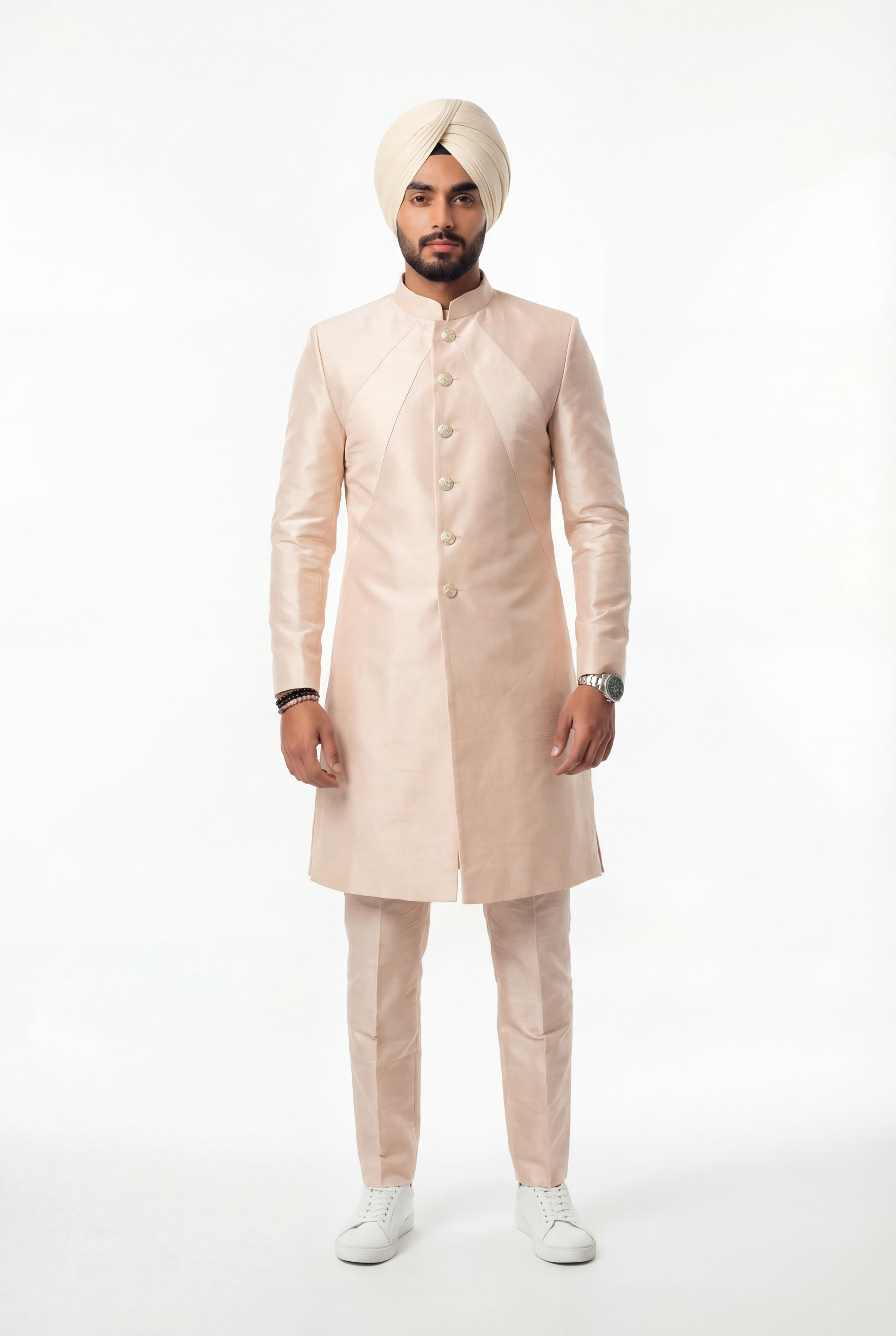 The ADNAN Beige and Blush Jacket is crafted from a polyester dupioni, featuring texture and subtle sheen. The carefully balanced palette of warm beige and soft blush creates the perfect sherwani for a modern groom or grooms party. Whether you're the father of the groom or a guest at an Indian wedding, this clean sherwani is the perfect blend of tradition and modern design.