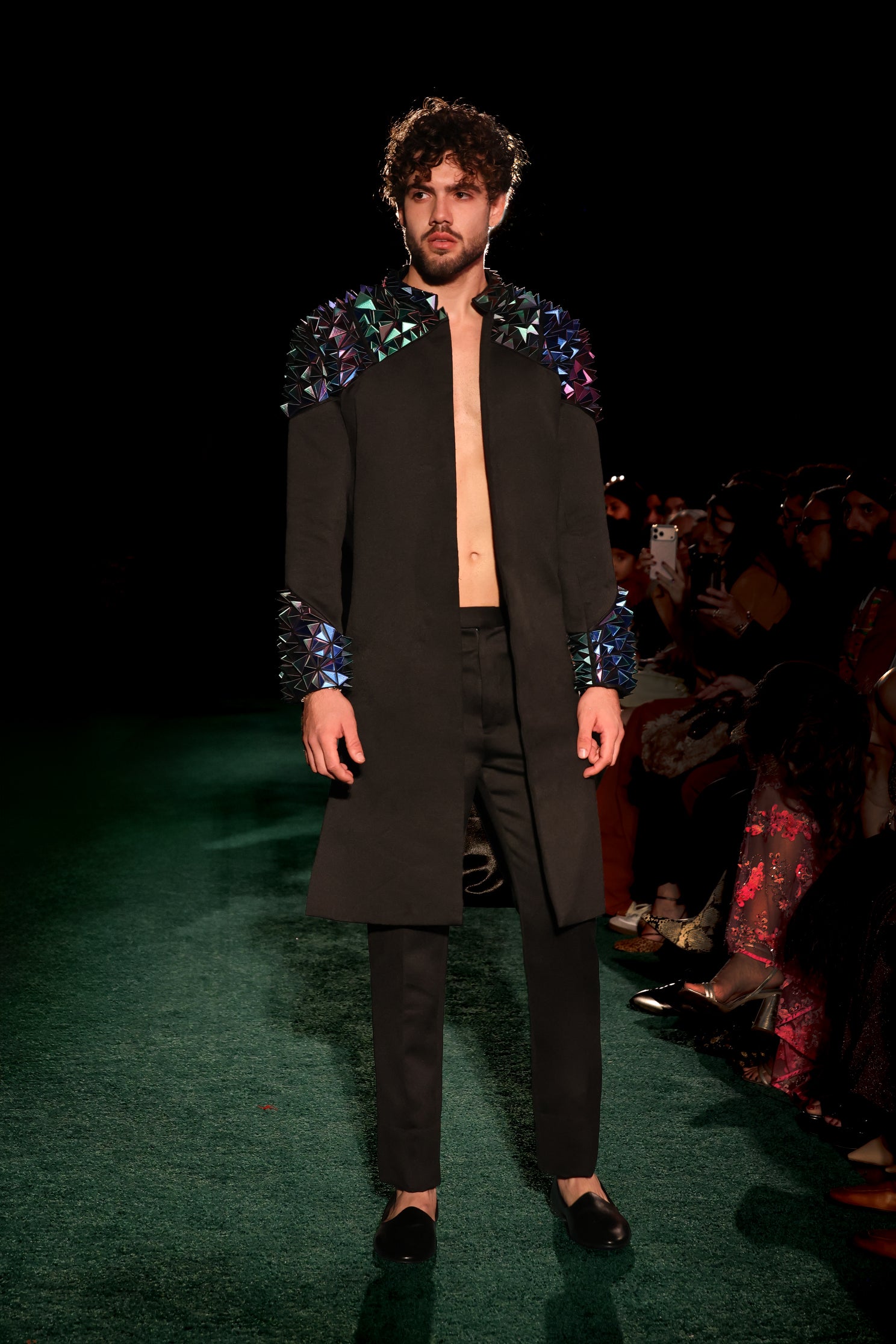 A modern take on formalwear, the AMIR 3D Printed Open Sherwani Jacket blends traditional sherwani tailoring with contemporary design. Sculptural 3D-printed accents at the shoulders and cuffs add dimension and add a unique design to this jacket. Designed for those who want something that's rooted in tradition but modern. Perfect for an Indian wedding - ideal for the sangeet or reception!