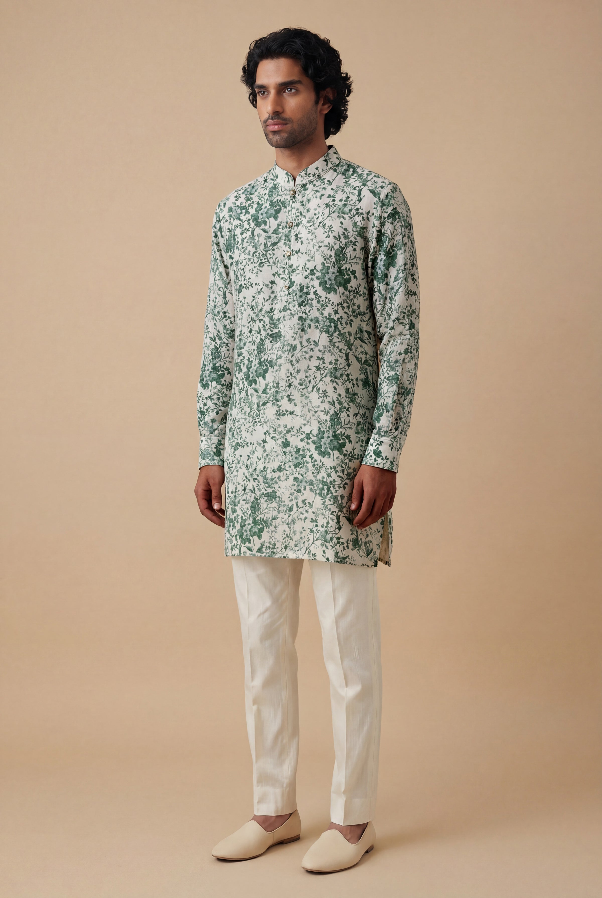 A fresh hunter green floral print on a neutral ivory base, is the perfect versatile piece to add to your wardrobe. Perfect for a wedding guest for the wedding ceremony, sangeet or mehendi, you can style with churidar/pajama pants to complete the look.