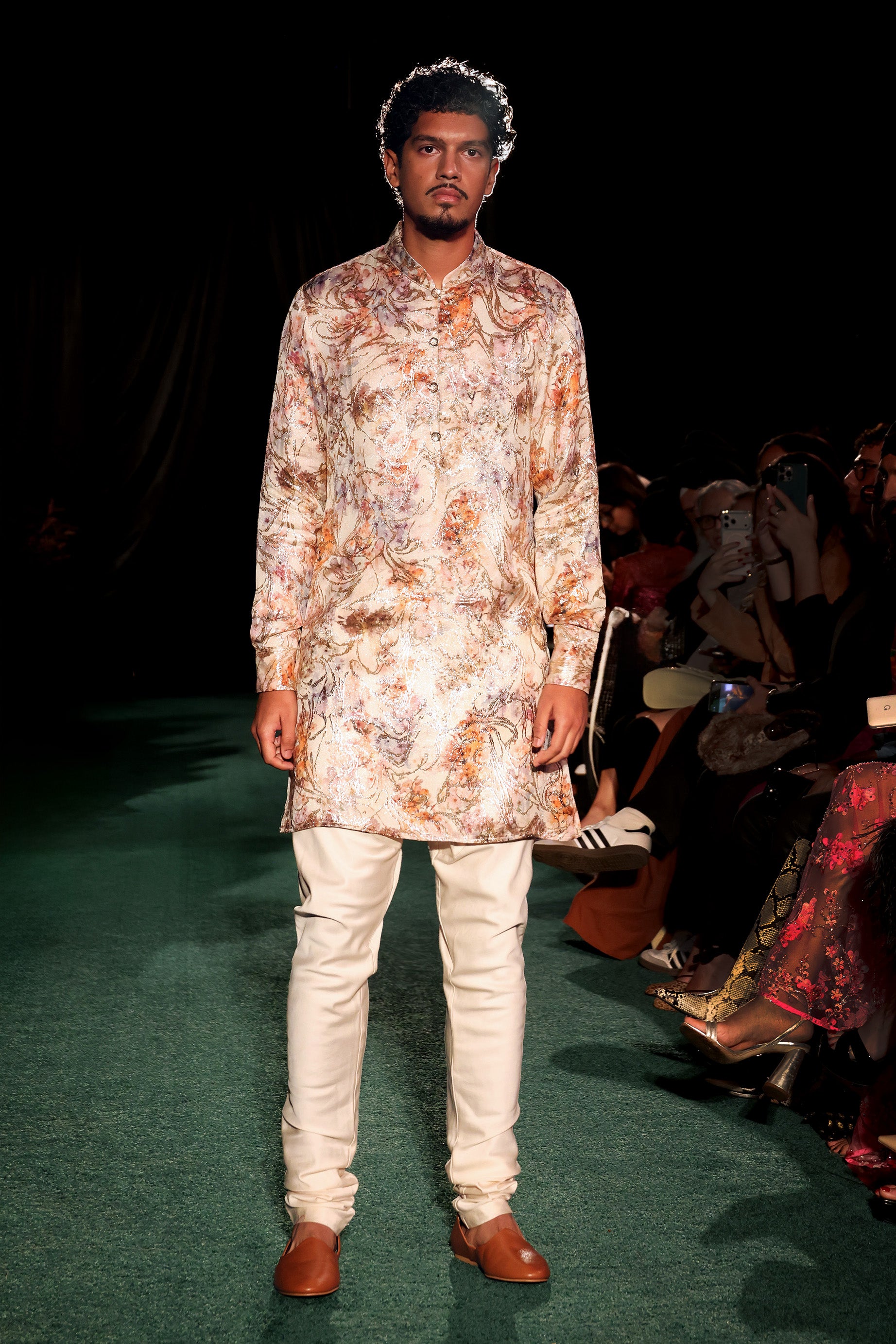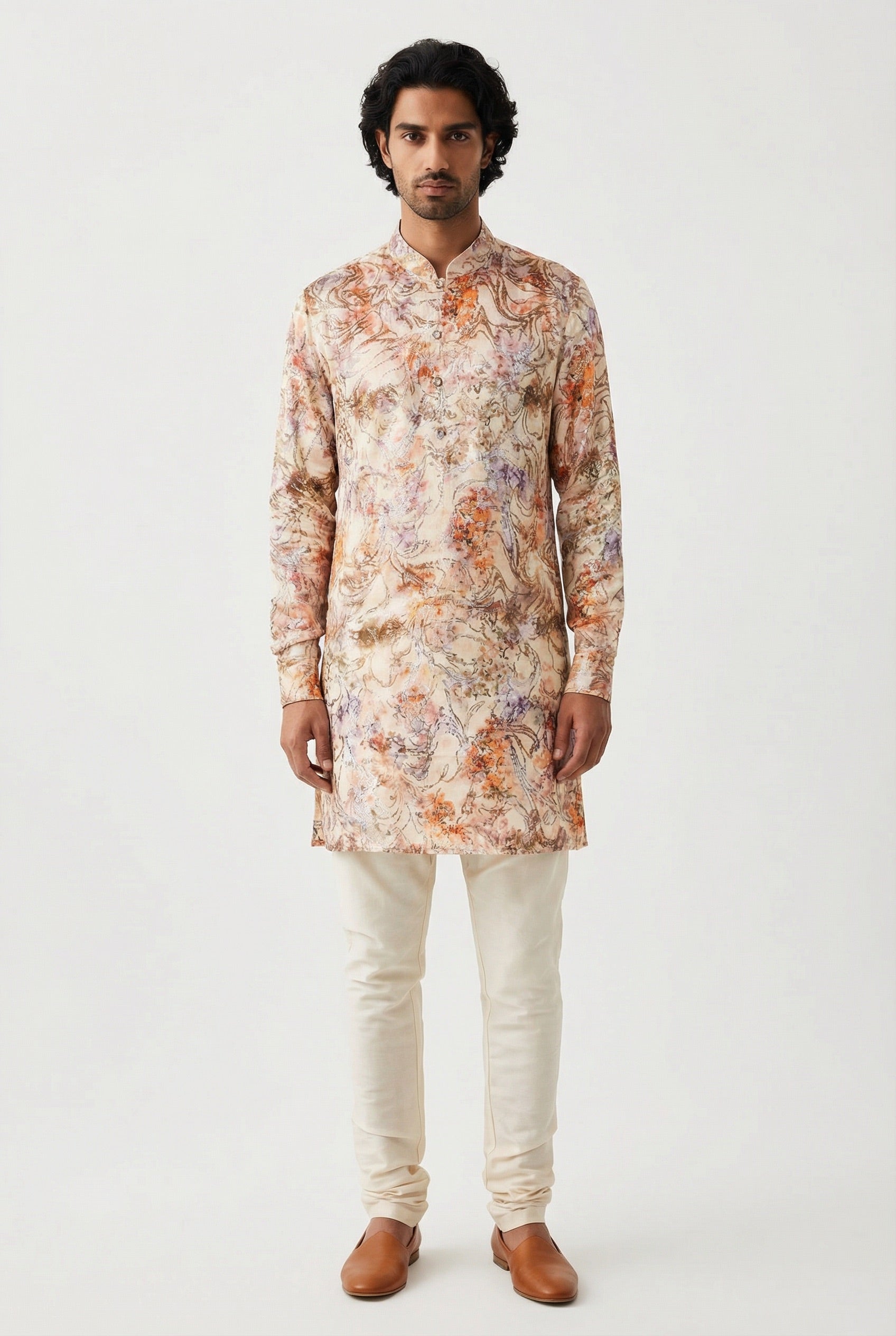 The KENJI Gold Floral Kurta, where delicate florals meet shimmering metallic accents. This stunning piece features a neutral cream base adorned with lustrous gold details, and flowers in pastel shades of peach and lavender, creating an effortlessly elegant look perfect for an Indian wedding ceremony or mehendi.