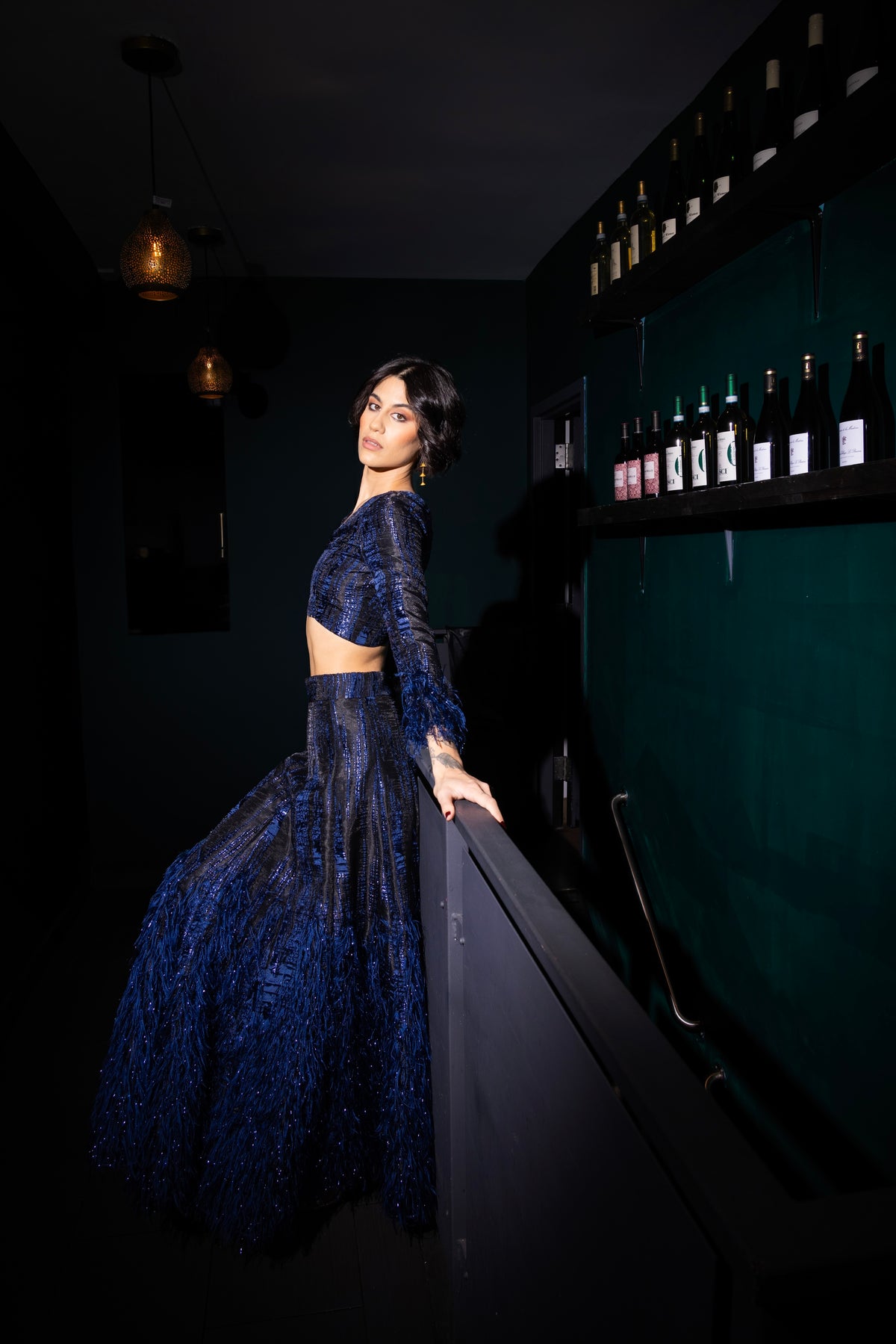 Party all night long in this black and dark blue long sleeve top. Accented with metallic fringe at the cuff for the perfect pop, style with a high waisted skirt for a reception night or with wide leg pants for a modern evening look!