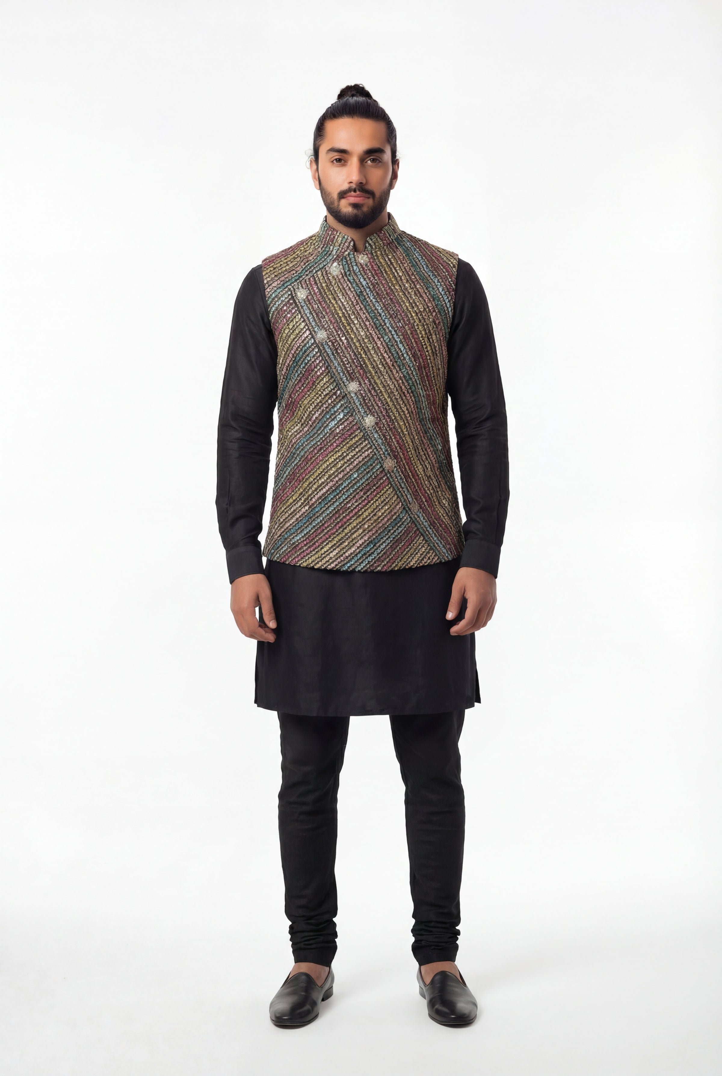 Show-stopping bandi vest with a diagonal striped sequin embroidery throughout and an asymmetrical front button closure.