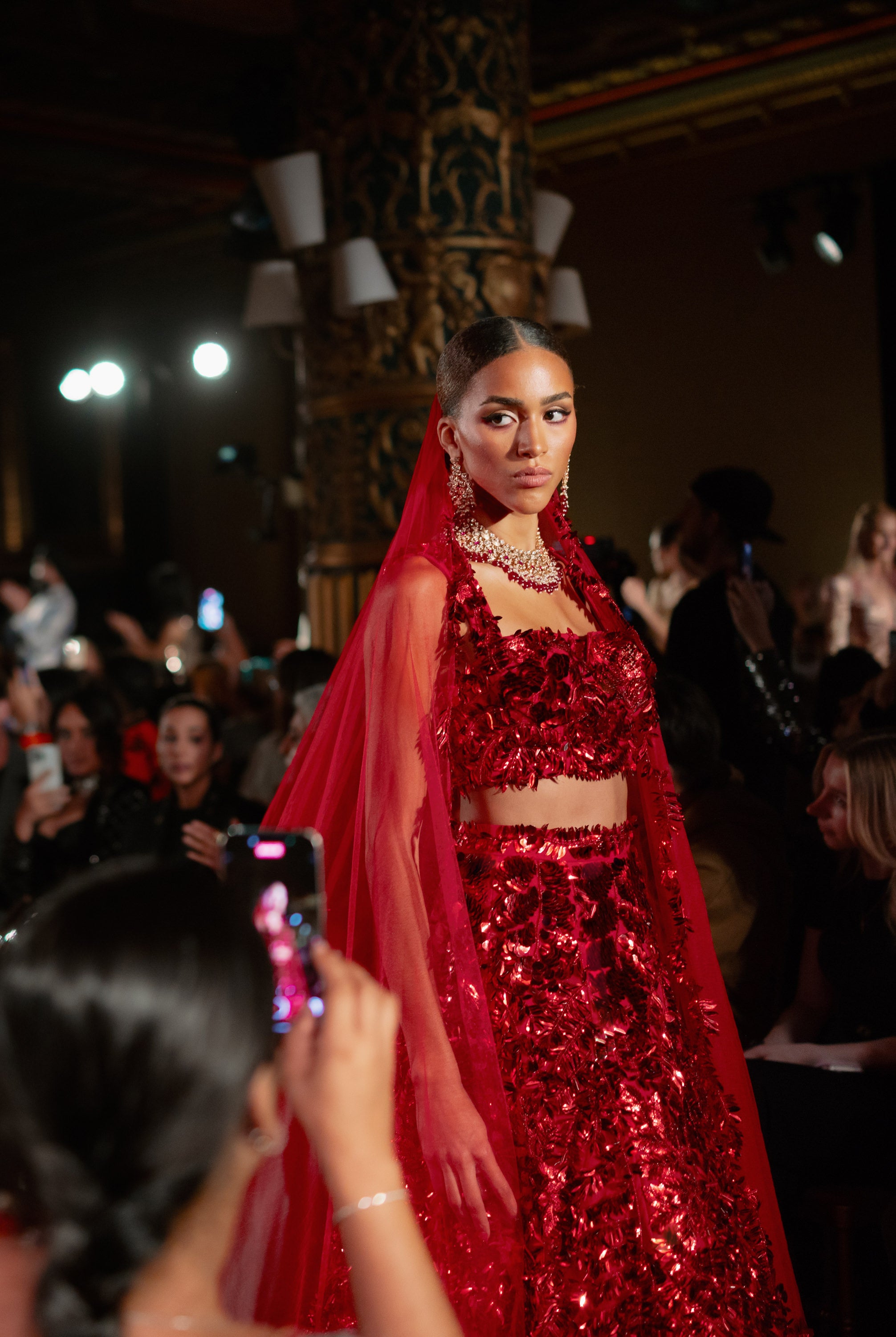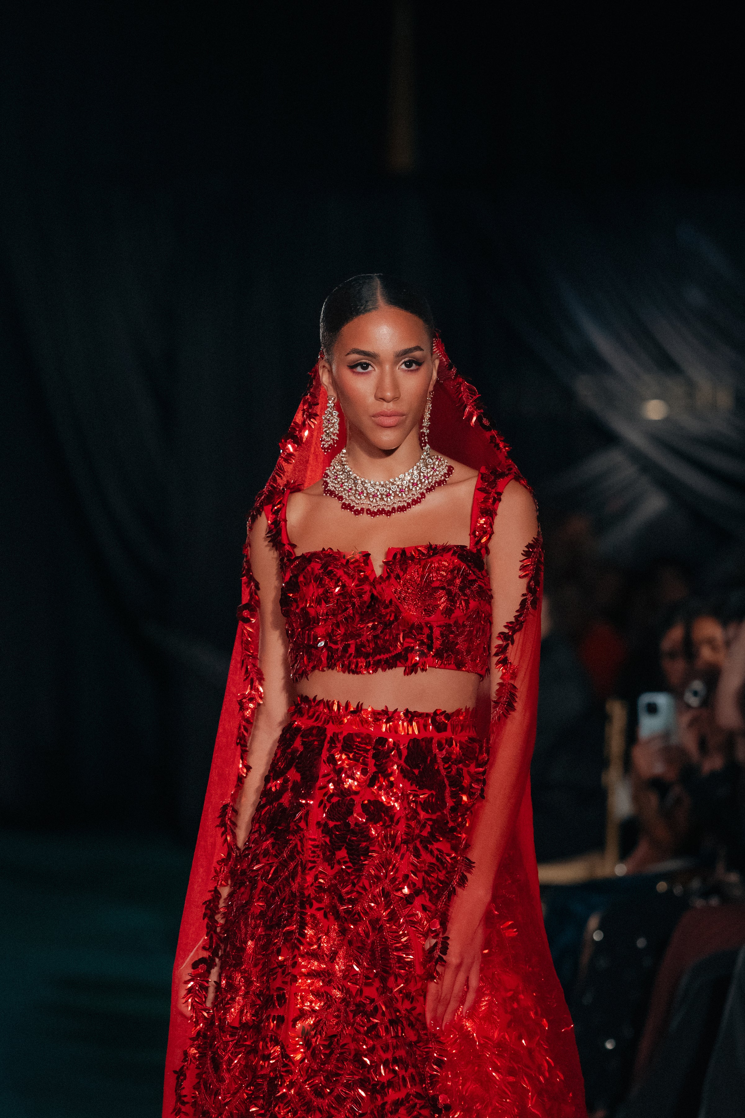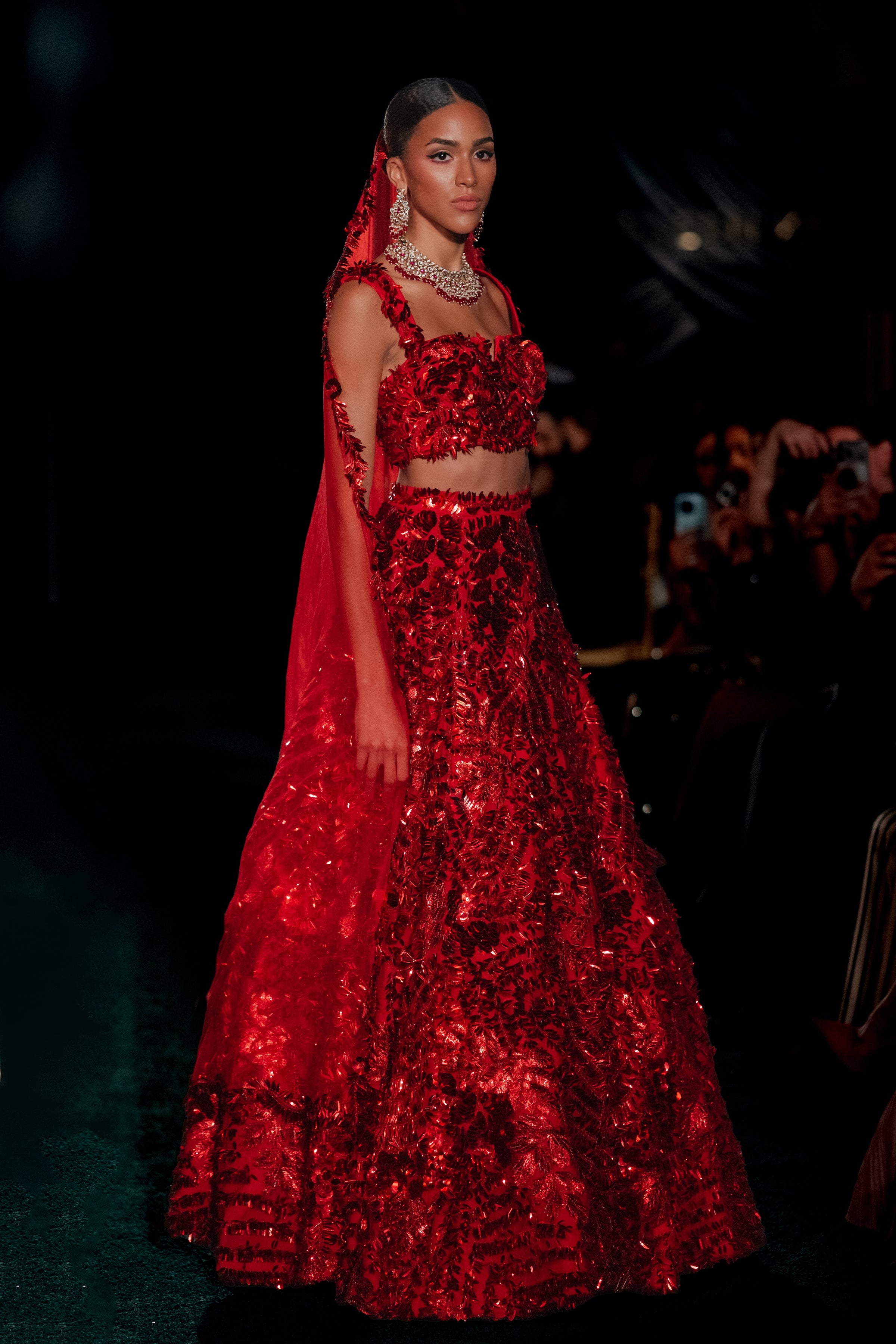 The most exquisite red bridal lehenga set, the SAMIAH captures timeless elegance with a contemporary edge. Adorned with delicate sequins in various floral and petal shapes, the texture and embroidery makes this an ethereal but glamorous bridal look. The rich red hue radiates tradition and romance, perfect for the bride who wants to honor heritage while embracing her own distinctive style.